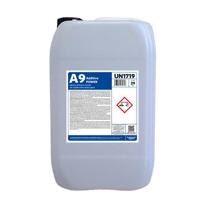 Alkalický zosilňovač pracieho účinku A9 POWER pre systém Professional support je vyvinutý na efektívne odstraňovanie prírodných tukov a škvŕn od krvi. Výborne účinkuje na bavlnu a zmiešané vlákna. Zvyšuje zásaditosť pracieho kúpeľa bez dodatočného zaťaženia pranej bielizne. Je vhodný najmä na silne znečistenú bielizeň. Zabraňuje opätovnému usadzovaniu nečistôt v bielizni. Účinne odstraňuje organické nečistoty vrátane škvŕn od bielkovín. V kombinácii s ďalšími prostriedkami Professional support zabraňuje poškodeniu bielizne. Je vyvinutý primárne pre systém Professional support s automatickým dávkovaním. Je určený predovšetkým pre profesionálne práčovne. Nastavenie a inštaláciu vykonáva technik Professional support.