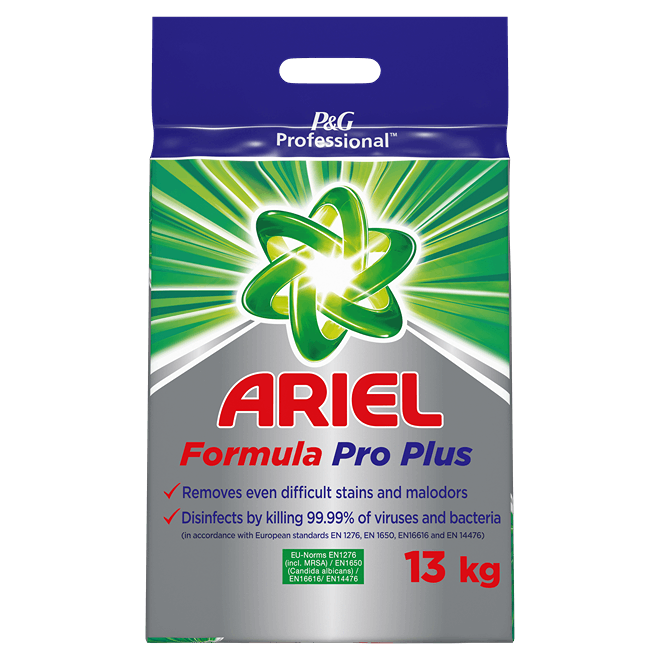 Ariel Formula Pro Plus je dezinfekčný prací prášok na profesionálne použitie v oblasti zdravotníctva a sociálnej starostlivosti. Odstraňuje najodolnejšie škvrny a zabíja 99,99% baktérií a obalených aj neobalených vírusov. Je vyvinutý tak, aby dosahoval vynikajúce výsledky už pri prvom praní bez nutnosti namáčania alebo predpierania. Obsahuje špeciálne bieliace technológie, ktoré pomáhajú udržať bielizeň žiarivo bielu po dlhší čas. Obsahuje jedinečnú kombináciu vysoko koncentrovaných čistiacich zložiek novej generácie. Kombinuje pokročilý systém povrchovo aktívnych látok s technologicky vyspelými enzýmami a polymérmi, ktoré sú mimoriadne účinné pri odstraňovaní odolných škvŕn a ľahko prenikajú do hĺbky vlákna. Funguje aj v náročných podmienkach, akými sú nízke teploty (od 20 °C) a krátke pracie cykly. Neobsahuje fosfáty. Jedno balenie vyperie viac ako tonu bielizne.