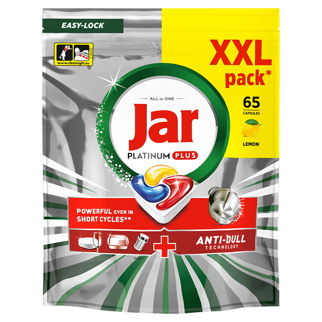 Kapsuly do umývačky Jar Platinum Plus dosahujú vynikajúce čistiace účinky, pomáhajú odstraňovať zašednutie vznikajúce časom a obnovujú pôvodný lesk riadu. Majú zabudovaný systém predumývania, takže riad nie je potrebné pred vložením do umývačky umývať. Odstraňujú mastnotu nielen z riadu, ale aj z filtra, čo vedie k čistému riadu a dobre udržiavanej a čistej umývačke. Zároveň pomáhajú chrániť umývačku pred vodným kameňom. Jedna kapsula spája tekutý aj práškový umývací prostriedok, ktorý chráni vysoko rozpustný obal. Po vložení do umývačky sa obal okamžite rozpustí, uvoľní jej obsah a riad sa začne ihneď umývať. Skvele a spoľahlivo fungujú aj pri krátkych umývacích cykloch.