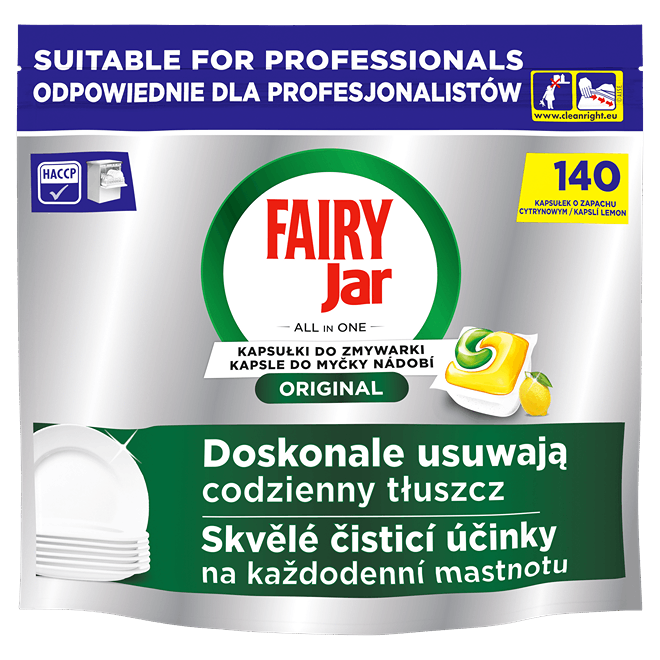 Kapsuly do umývačky riadu Jar Professional Original (All in 1) sú vyvinuté na umývanie riadu v umývačkách pre domáce aj profesionálne použitie (umývací cyklus 1 – 5 min.). Účinne umývajú dokonca aj zaschnuté škvrny od rúžu, kávy a čaju. Rozpúšťajú sa 2x rýchlejšie ako bežné pevné tablety. Povrchovo aktívne látky zabezpečujú dokonalé odstránenie zvyškov jedál a mastnoty z riadu a zabraňujú ich opätovnému usadzovaniu na príboroch, tanieroch a skle. Sú účinné pri všetkých stupňoch tvrdosti vody. Obal je recyklovateľný. V súlade s HACCP.