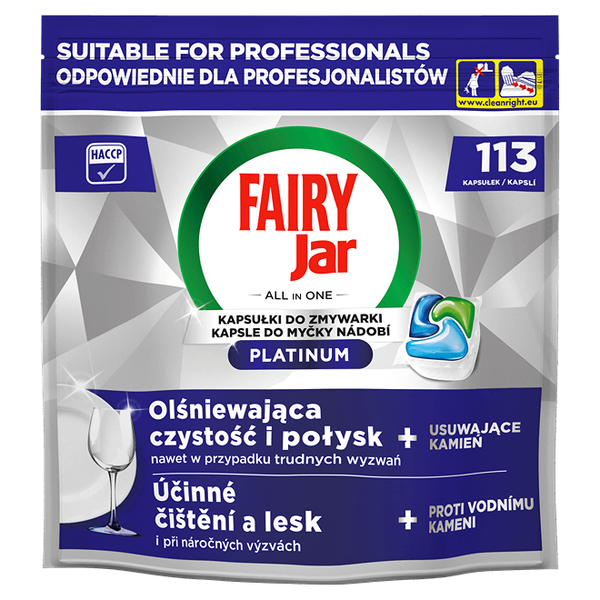 Kapsuly Jar Professional Platinum sú vyvinuté na umývanie riadu v automatických umývačkách. Povrchovo aktívne látky zabezpečujú dokonalé odstránenie zvyškov jedál a mastnoty z riadu a zabraňujú ich opätovnému usadzovaniu na príboroch, tanieroch a skle. Účinne čistia filter a zanechávajú umývačku čistú a riad dokonale lesklý. Rýchlo sa rozpúšťajú a sú účinné pri všetkých stupňoch tvrdosti vody. Nie je potrebné ich vybaľovať. Obal je recyklovateľný.