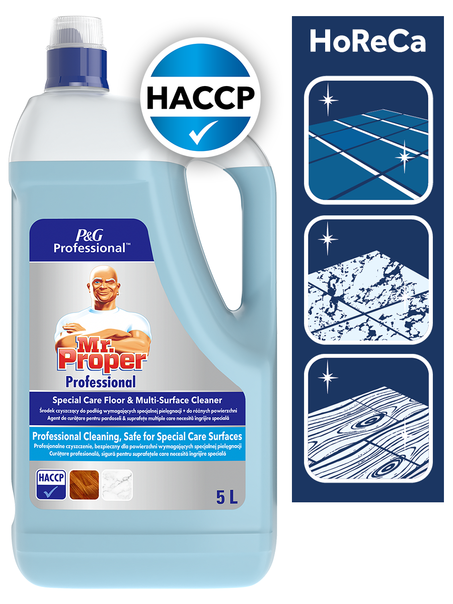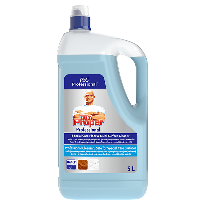 Univerzálny profesionálny čistiaci prostriedok na podlahy a citlivé povrchy Mr. Proper. Vďaka inovatívnej technológie účinne odstraňuje nečistoty a dosahuje vynikajúce výsledky aj pri čistení citlivých povrchov vrátane mramoru, prírodného kameňa a keramiky. Môže sa používať riedený aj neriedený. V prípade použitia riedeného produktu nie je potrebné oplachovanie. Je vhodný aj na použitie v automatických strojoch na čistenie podláh. Zanecháva dlhotrvajúci lesk a sviežu, príjemnú vôňu. Jeden 5 L kanister vystačí po zriedení na 83 päťlitrových fliaš čistiaceho prostriedku.