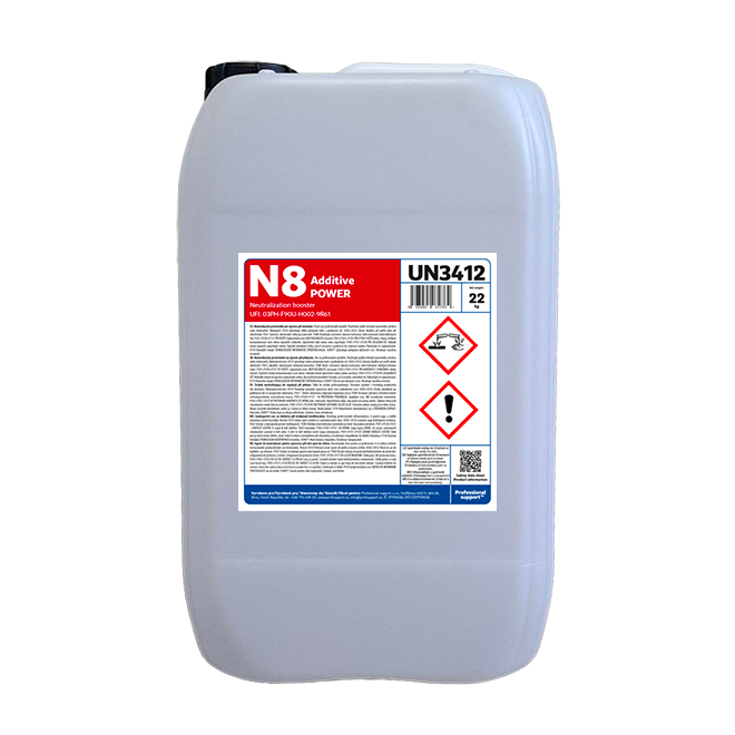 Koncentrovaný kyslý neutralizačný prostriedok N8 POWER pre všetky druhy bielizne je určený na použitie v rámci systému Professional support. Upravuje pH plákacieho kúpeľa. Odstraňuje organické materiály, zvyšky detergentov a vodný kameň z textílií aj práčky. Zabraňuje zožltnutiu textílií a podráždeniu pokožky. Zabraňuje usadzovaniu vodného kameňa na bielizni a predlžuje tak jeho životný cyklus. Znižuje aj usadzovanie ďalších látok v textíliách. Znižuje zvyškovú zásaditosť a zavápnenie textílií, vďaka čomu bielizeň zjemňuje a zároveň odstraňuje zatuchnutý zápach. Bielizeň je pri použití N8 POWER jemnejšia a príjemne vonia. Chráni vlákna, predlžuje životnosť praného textilu a zlepšuje tak ekonomiku pracieho procesu. Obsahuje biologicky odbúrateľné zložky. Je vyvinutý primárne pre systém Professional support a je určený predovšetkým pre profesionálne práčovne. Nastavenie a inštaláciu vykonáva technik Professional support.